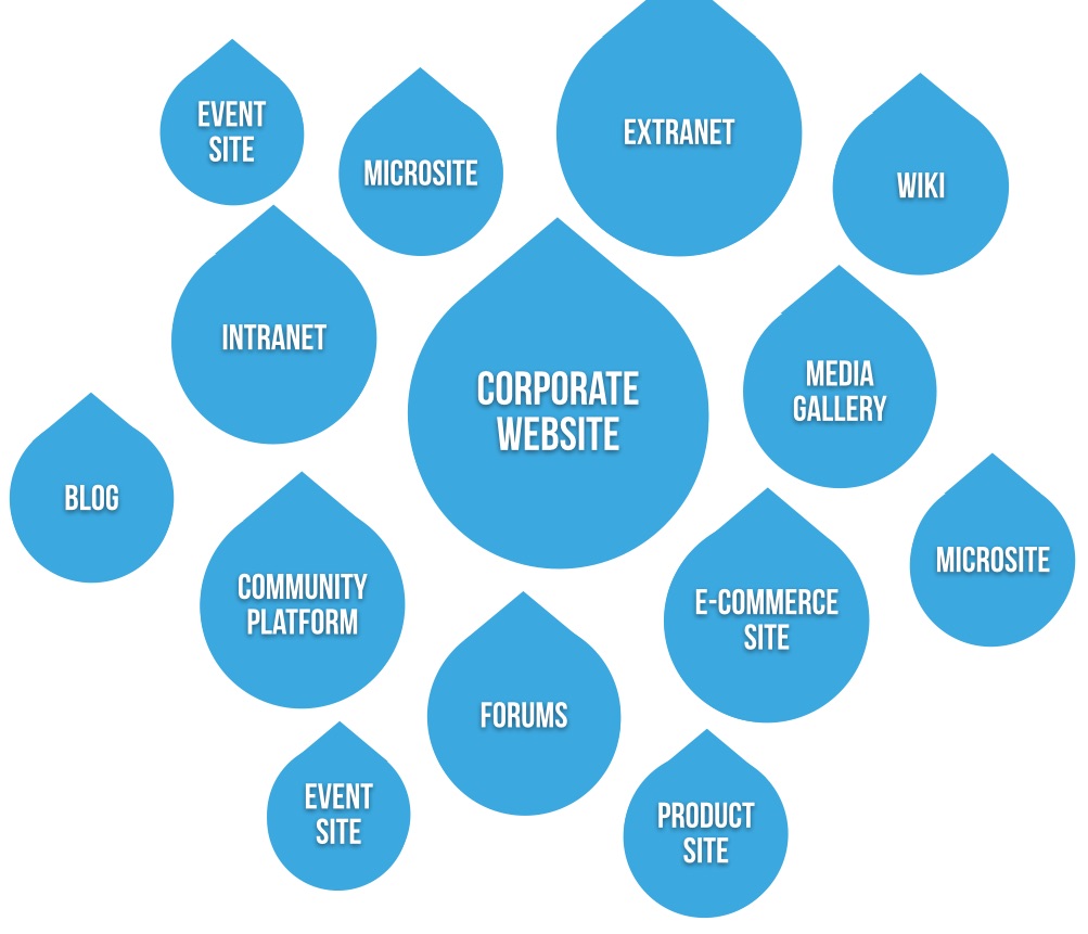 When managing many sites, Drupal has an unfair advantage in that it scales from simple to complex easily. That scalability, coupled with a vast ecosystem of modules, elevate Drupal from a single site point solution to a platform on which you can build almost any kind of site: a brand site, a corporate website, a customer support community, a commerce website, an intranet, etc. You name it.