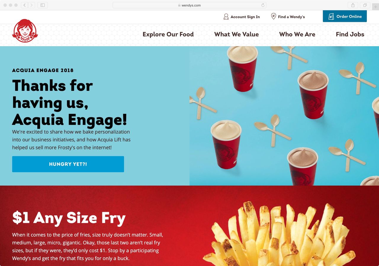 For the occasion, the team at Wendy's decided to target Acquia Engage attendees. If you visited Wendys.com from Acquia Engage, you got the following personalized banner. It's a nice example of what you can do with Acquia Lift.