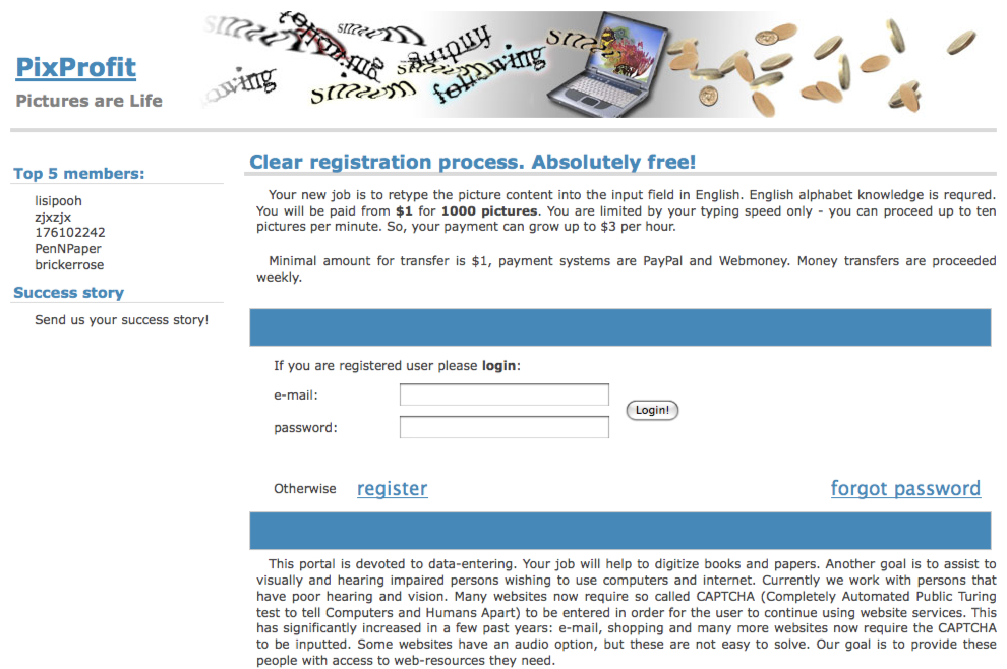 We've all heard stories about people who are paid to solve CAPTCHAs. Well, through my Mollom work, I recently learned about PixProfit. Using that site, you can earn $1 for every 1,000 image CAPTCHAs that you solve on behalf of spammers. Indeed, according to the site, "You are limited by your typing speed only - you can proceed up to ten pictures per minute. So, your payment can grow up to $3 per hour.". Crazy!