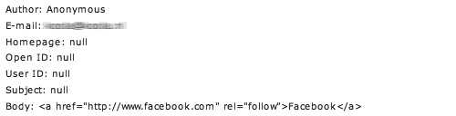 3. Some spammers try to take advantage of other companies' positive brand and reputation. In the example below, the spammer tries to leverage Facebook's reputation to build a positive Mollom or Akismet reputation of its own.